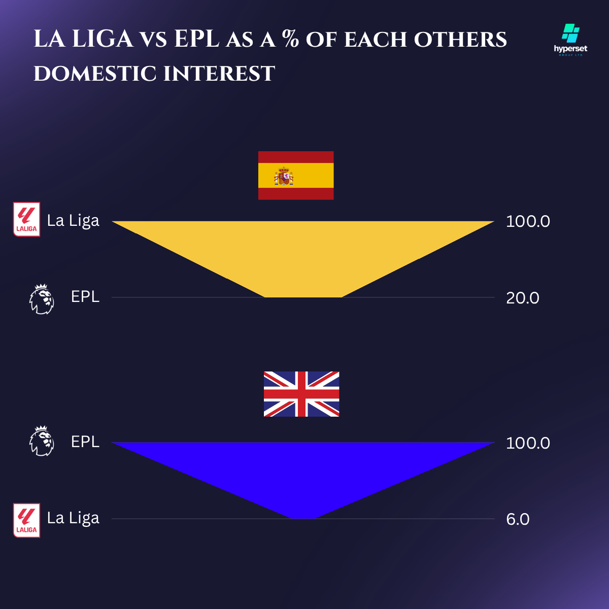 The Premier League gains more traction in Spain as a share of La Liga search traffic, than La Liga does when compared to the Premier League in the UK. The EPL is searched at 20% of the rate La Liga is in Spain, however, La liga is searched at just 6% of the rate of the rate in the UK.